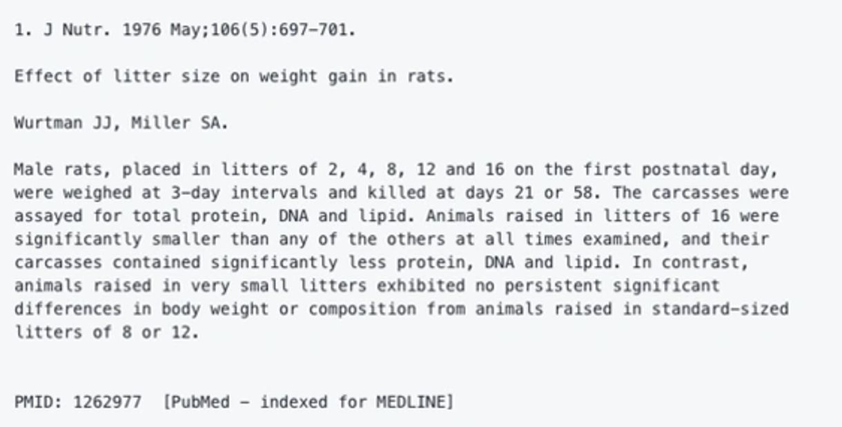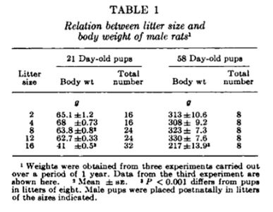 Pour vous démontrer plus en détail le développement des petits dans de plus petites/grandes portées voici un tableau tiré directement du site de recherche du US National Library of Medicine (National Institute of Health: http://www.ncbi.nlm.nih.gov/pubmed/1262977 ) provenant d’une étude menée en 1976 sur les portées de 2, 4, 6, 8, 12 et 16 petits.