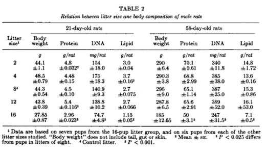 Dans ce deuxième tableau on peut observer la différence de poids, de protéines, d’ADN et de lipides qui sont considérablement réduits dans une portée plus large.