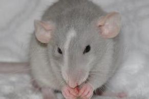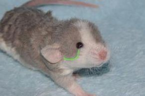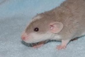 Après presque 3 semaines on voit déjà son pelage changer et devenir parsemé de poils blancs. Il continuera ses mues tout au long de sa vie. Certain rats vont garder plus de couleur tandis que d'autres deviendront complètement blanc avec l'âge.