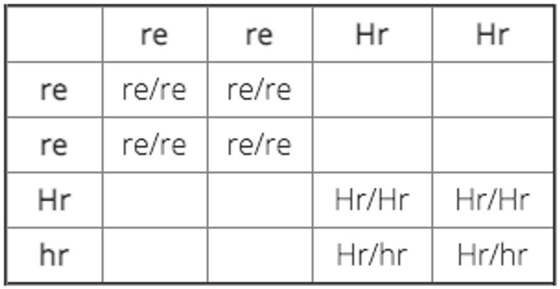 Le parent Lisse donne une copie du gène Lisse (re) à chacun de ses bébés. Le parent Nu va donner lui aussi une copie du gène Lisse (re) et une copie du gène Nu (hr) à chacun de ses bébés.