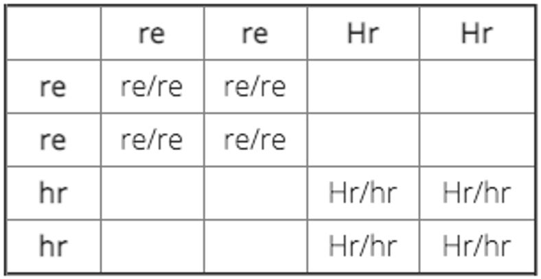 Le parent Lisse donne une copie du gène Lisse (re) à chacun de ses bébés, ainsi qu'une copie d'un des gènes de Nu qu'il possède (hr ou Hr). Le parent Nu donne une copie du gène Lisse (re) ainsi qu'une copie du gène de Nu (hr) à chacun de ses bébés.